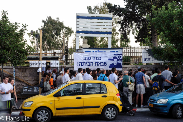 Walked over to the PM’s residence to look at the Shalit tent. Lots of people were gathered watching news on a large screen.