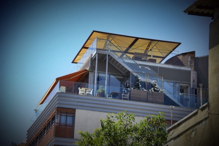 Slentrer tilbake til hotellet. Hmm. Fullt hus på rommet mitt. Ja, ja. Rusler på toppetasjen og sløver under parasollen. Litt irriterende med typen som driver og kapper materialer..