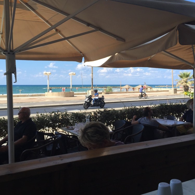 Some are in a hurry, others stroll by. Cars behind me in a steady flow, honking impatiently when they get the green light. Old guy with broom making the walk clean and tidy. Electric bikes sneak in on you at high speed. Pigeons begging for food. A guy at the beach proposed to his girl. Happy, she was, doing the chicken dance(?). Some tourist with a tele lens photographed it all, rushing over to show them. Safta rolling her grandkid.